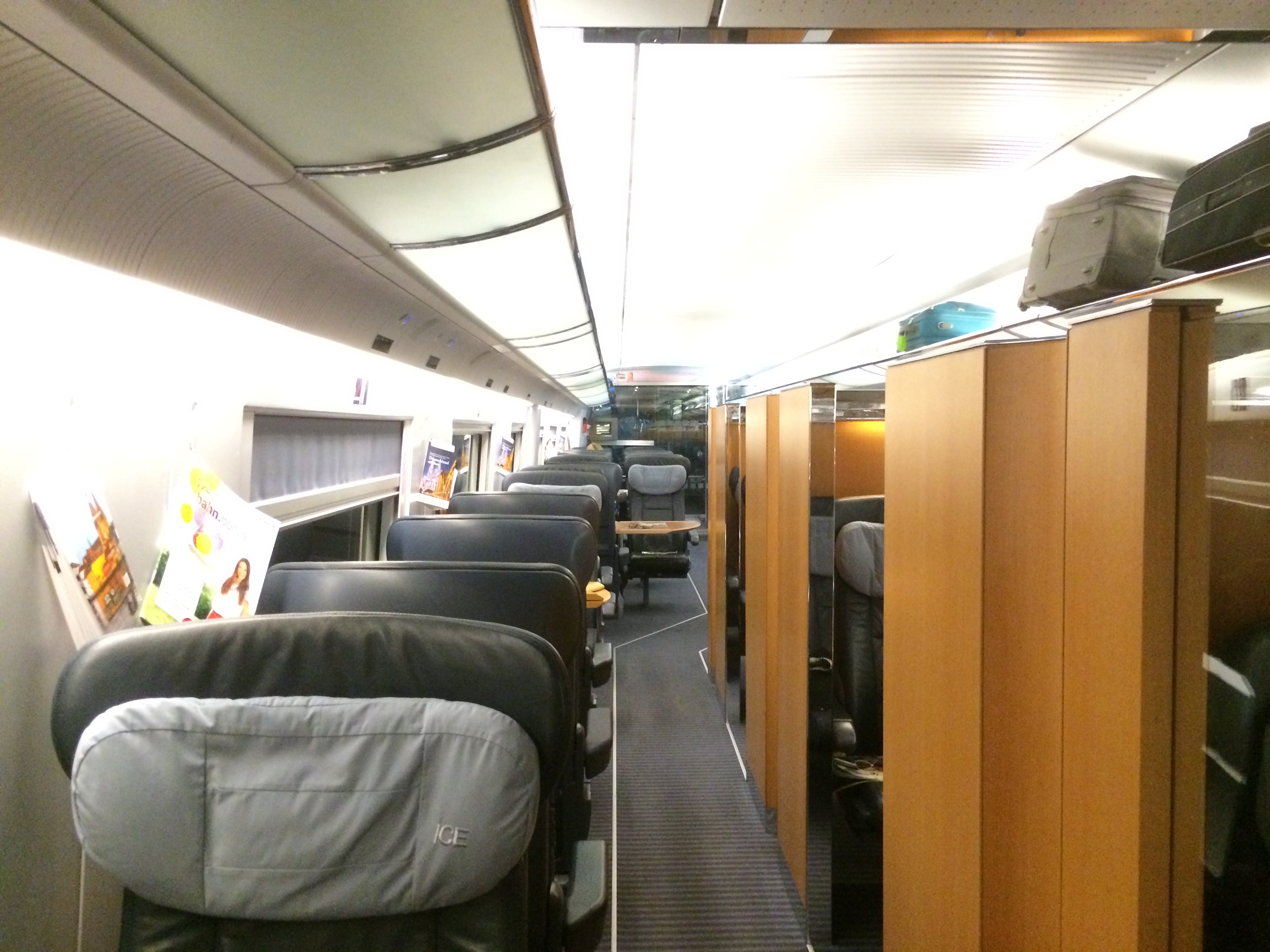 I wish the whole ride were on this ICE train, though. What a train! A smooth ride, comfortable faux-leather chairs lined in a row of single seats along my side of the car, a big window to my left and a useful and wide (for transit) table in front of me. The doors between cabins are glass and are automated – when one walks up to any one of them, it opens with a pffft of air and slides open, seemingly without friction, to reveal the world of the next car. I walk to the rear of the train and snapped a photo of what would be the seat of the train’s conductor (or is it pilot, at these speeds?). The window in front of the captain’s chair is slanted outward at a severe angle, matching that of the exterior of the train, and there’s an intricate control panel in front of where he or she would sit. Fantastic.