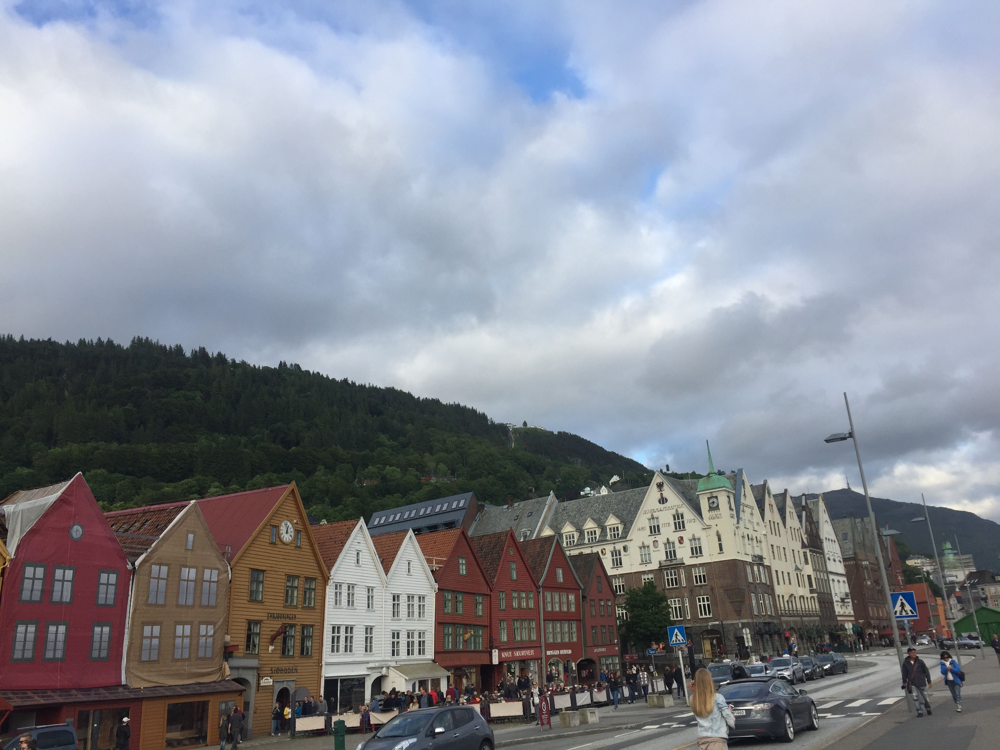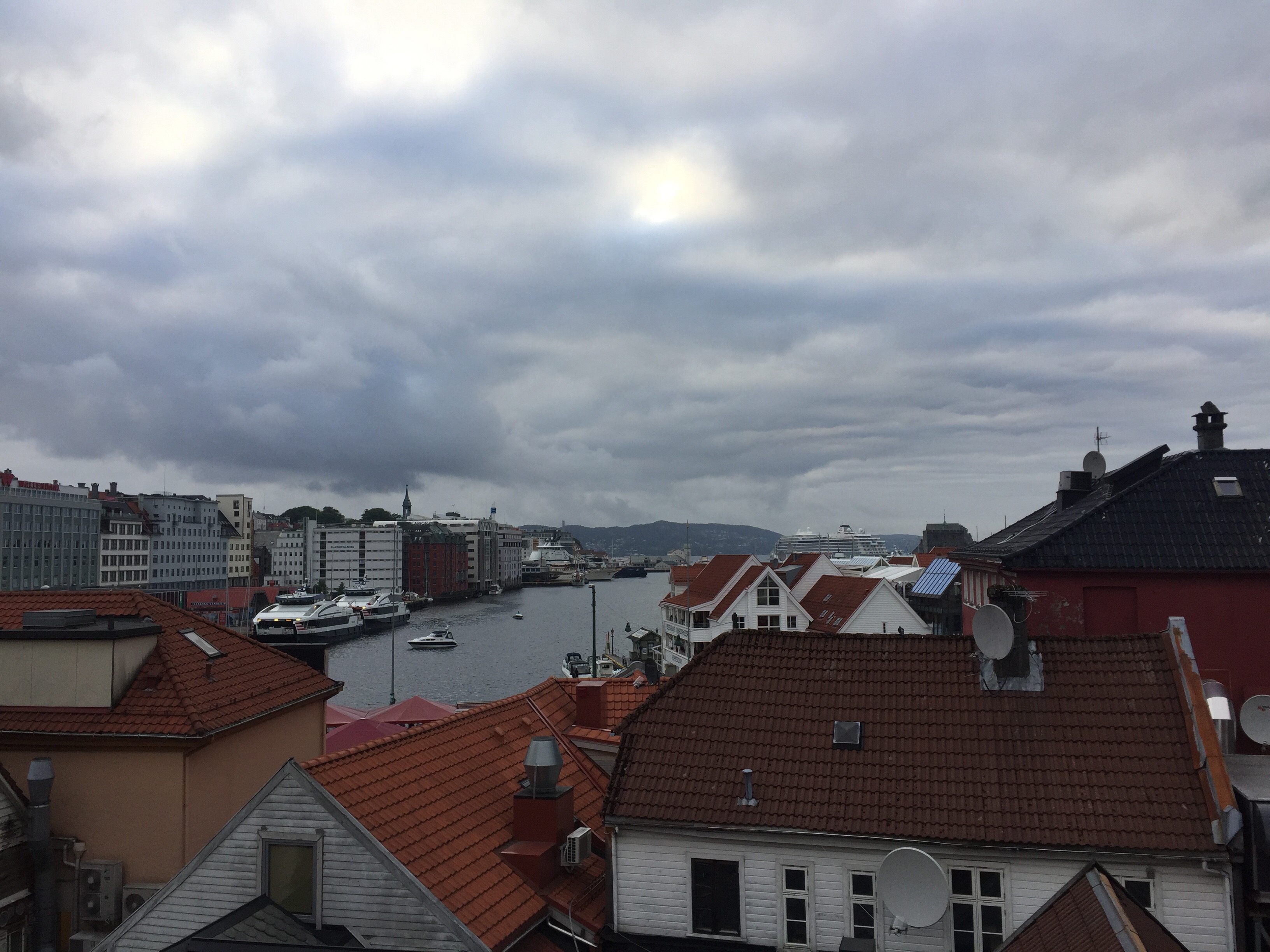 I arrived in Bergen yesterday afternoon. It’s a lovely town, but not the sort of place with which I could fall in love. It’s a tourist haven. It feels like the outdoorsperson’s variant of a place like Bruges or the Cinque Terra. Overrun, locals outnumbered 7 to 1 (Bergen is a bit better in this regard, as the numbers in those other places are much worse, but it seems that it still is 100% dependent on tourism and isn’t otherwise self-sufficient). The harbor is filled with yachts, sailing ships, and at least one massive cruise boat (I’m awoken in the morning with blasts from its deck horns). The aged buildings along the wharf edges are beautiful, as are the green hills/mountains around the north, south, and east of the village. The sun, once more, isn’t set when I went to bed after 11pm, but I slept much better last night than the second night in Oslo. Today holds reading, writing, and perhaps a walk up a hill to get a view of the harbor. To be honest, though, I’m a bit dampened in my enthusiasm about Bergen in particular and Norway in general because of the costs associated with mere existence in this place.