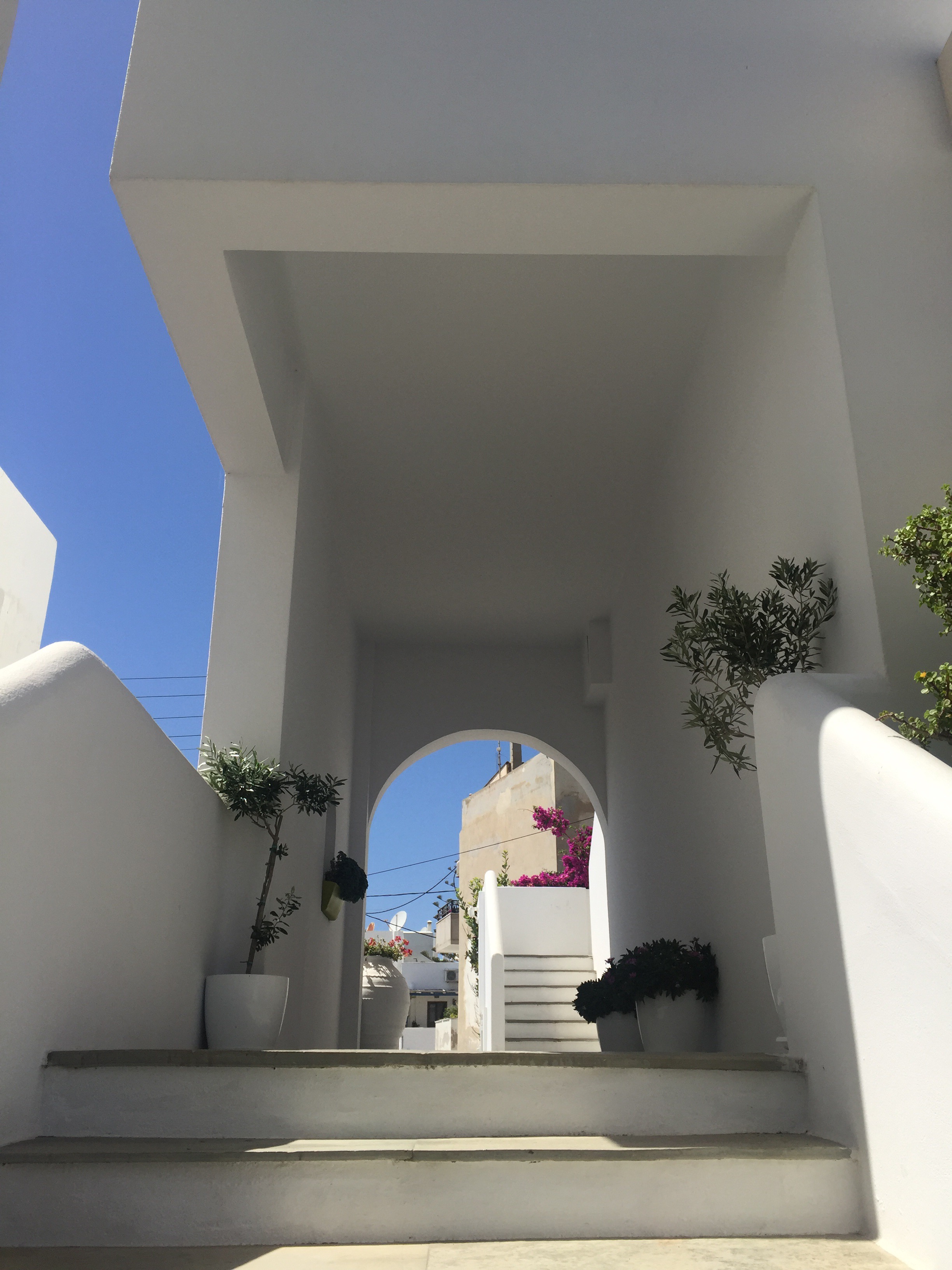 And tonight, I realized that it’s not service, properly thought of, that I’m experiencing at Margo Studio in Naxos. Upon my return from touring the labyrinthine walks (streets, per the map of the town) and having a long and casual lunch atop a castle that itself commanded a panoramic view atop the hill here in Naxos Town, I fell into a courtyard wicker chair exhausted and hot. Cold water was immediately supplied by George, and he then offered and brought out a frappe – essentially an iced cappuccino with some added sugar – and inquired if there was anything else I might wish. With no fee on top of the shop’s fee, he had my laundry taken to the local launderer and brought back within a few hours. (When the bag with laundry I’d set beside my chair began to tilt toward a bit of water from the plant beside me, George was careful to reach and rescue it – always a genuine concern from George.)