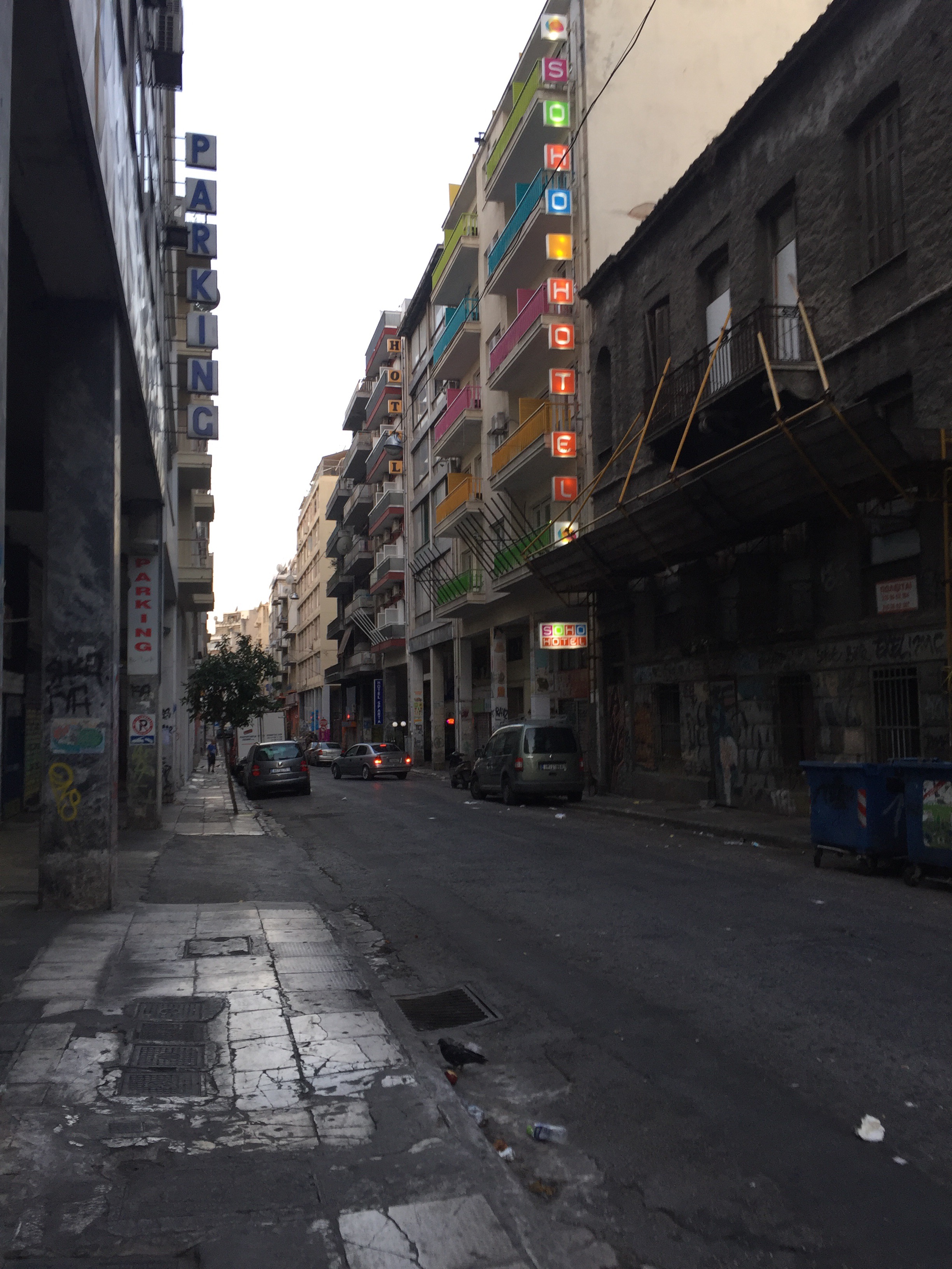 It’s the little things, really, that add up to a generally negative attitude on my part. The weirdly expensive Metro tickets, and the lack of a coherent rail-transit system (to be fair, my comparison point is Berlin or Dresden, both of which have been completely rebuilt in the last century – Athens hasn’t been so unlucky as to require a complete retooling). The prohibitively long lines at the Acropolis (which I didn’t see up close because I was unwilling to stand in the horde of waiting tourists). The falsely friendly desk manager at my hotel. The actual hotel room in which I found myself. The Chicagoan family who rejected my attempt at friendly conversation and traveler-in-kind advice-giving. There was the unmistakable wafting scent of garbage. (There had been a strike by garbage collectors over the week prior to my appearance at the port, and as if in preparation for my arrival, they had just gotten back to work – working double-routes – to clear the accumulated refuse. The smell hadn’t dissipated by the time I left three days later.) The neighborhood in which I settled for the duration was not a good neighborhood. While the hotel/hostel was clean enough, though it is a bit much to call it a gem merely tarnished by its surroundings. (In any decent neighborhood, I think this place would have seemed pretty bad, despite a very nicely apportioned ground floor.) It wasn’t a dangerous part of the city, exactly – at least I don’t think so – but it was run-down and largely vacant in the evenings. The homeless population between my hotel and the metro stop to which I walked on the third morning numbered in the dozens, and the pigeons scanning the streets for food were innumerable. I found myself walking north when I should have been walking south…