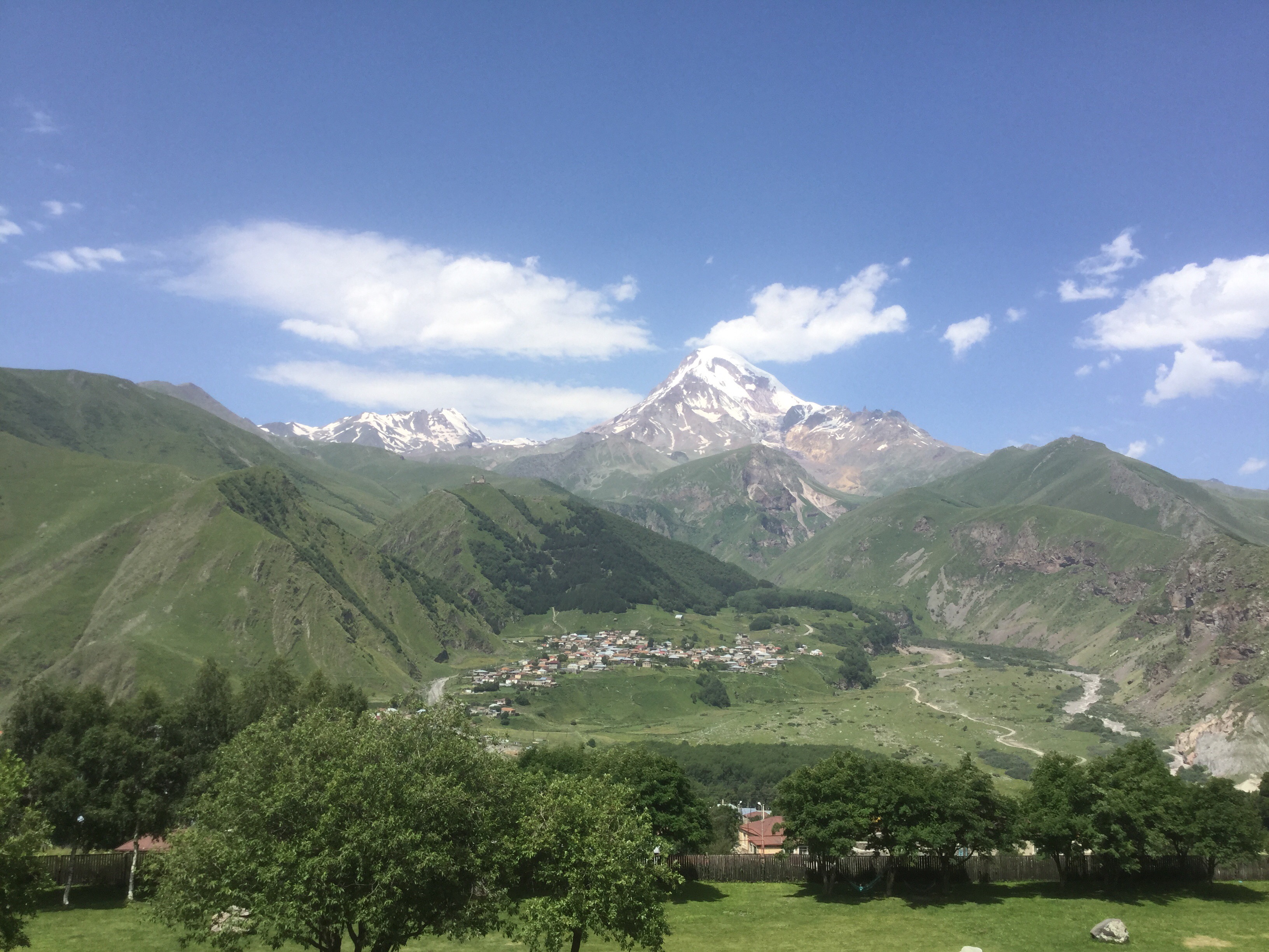 A wide valley at the exit from Tbilisi northwestward narrows as the highway turns more directly to the north (and passes quite close to the Russian-occupied zone in north-central Georgia). We drive along a rockslide-prone route taking us around a large, human-made lake. A dam at its southern end holds back the torrent that would ensue in its absence at the yearly snow melts of the staggering Caucuses mountains. The place is green – verdant with leafy trees – until we reach a place above the tree line, which is surprisingly low as compared with similar places in the United States (around 7 thousand feet / ~2100 meters as compared with upwards of 11 thousand feet in the U.S.).