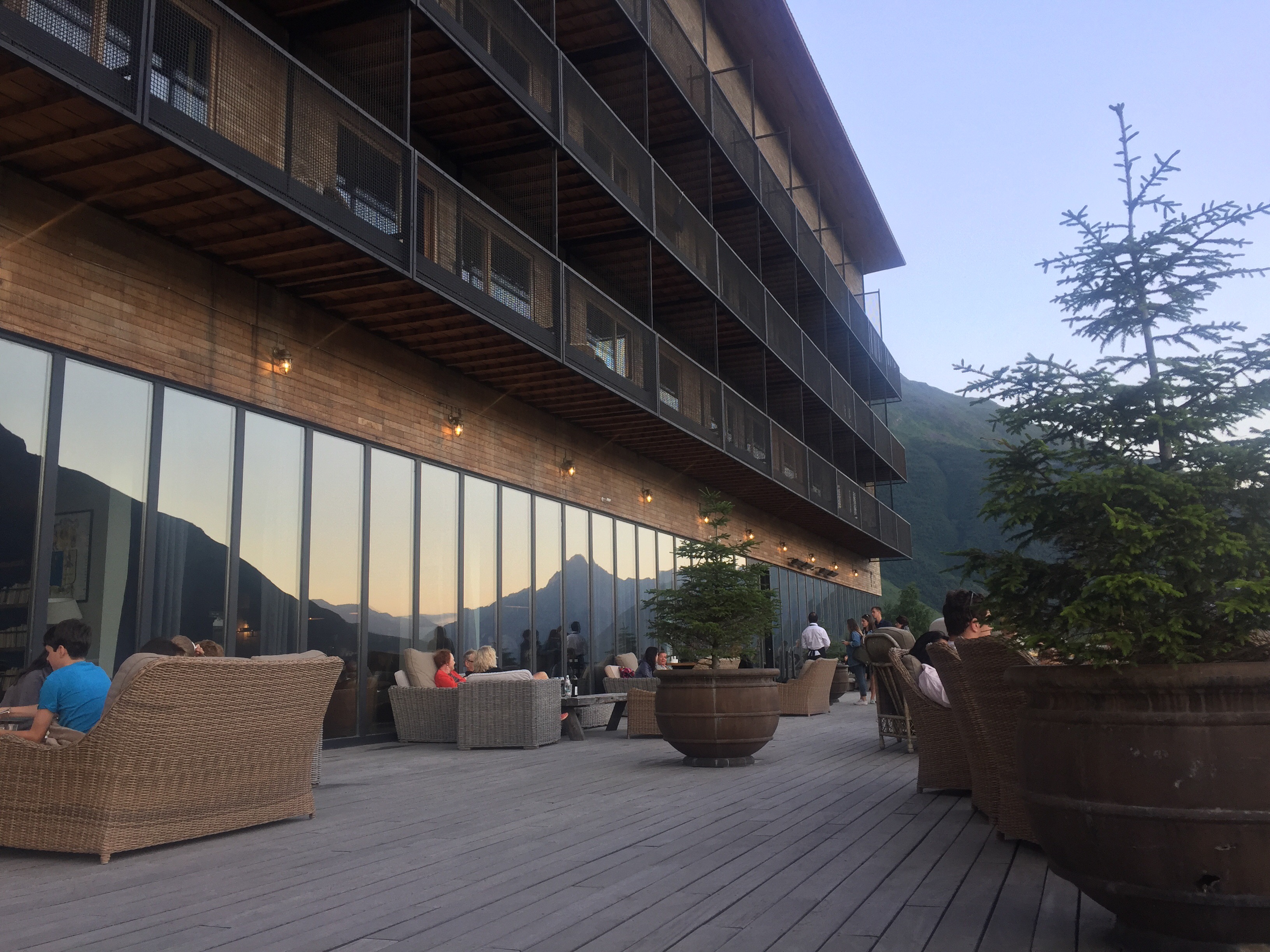 The views of the mountain are superb, particularly from the wide and popular terrace, and the “forest view” rooms face a smaller but closer-at-hand mountain. The hotel offers unaffordable (to me) helicopter rides. A defensive radar array (pointed toward the Russian border northward and “up”” the valley from here) and a Georgian Orthodox Church / monastery sit atop ridge tops to the west across the valley. The ground floor is an open floor plan of assorted chairs, low tables, and a bar whose tender can make anything simple that’s not coffee or a martini (so says my host).