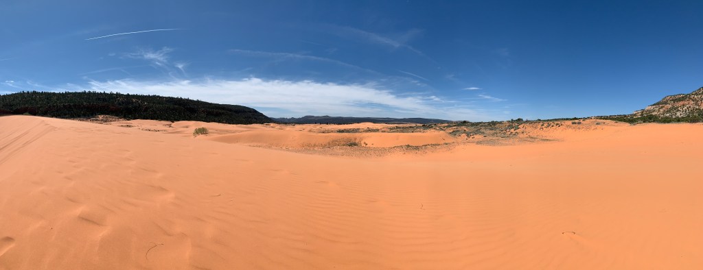 Drive home. We stopped along the way at a few places. First up was Coral Pink Sand Dunes – one of those small-time places that would be big-time if anyone were to find out about it. Nestled as it is between the Grand Canyon and Zion, nearby Bryce, and within a reasonable drive of the Paria Canyon, Glen Canyon Recreation Area, Canyonlands, Capitol Reef, … (you get the idea; the list is longer than this) – because of its proximity to these places, it might for many people be less interesting than its competitors. All the better.