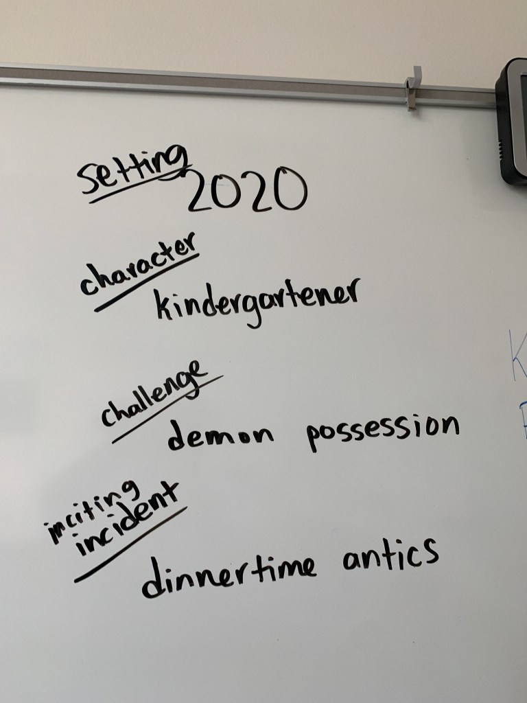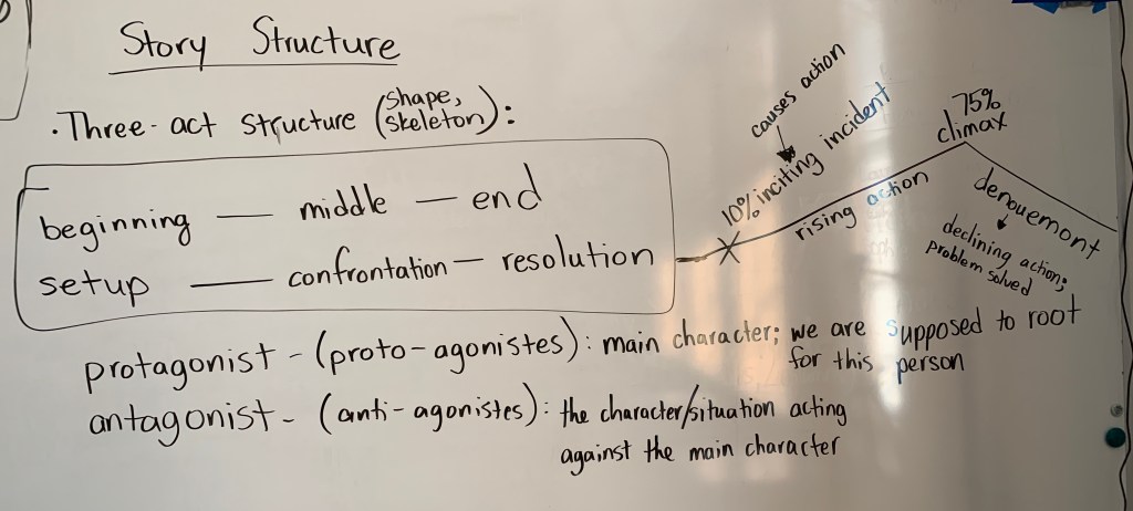 This morning, I had two 80-minute periods of my Humanities class. I decided it was a good day to talk about story structure. No internet meant that my students couldn’t pursue the investigation I had planned, so it was all off-the-cuff because – like so much else this year – necessity demanded it.