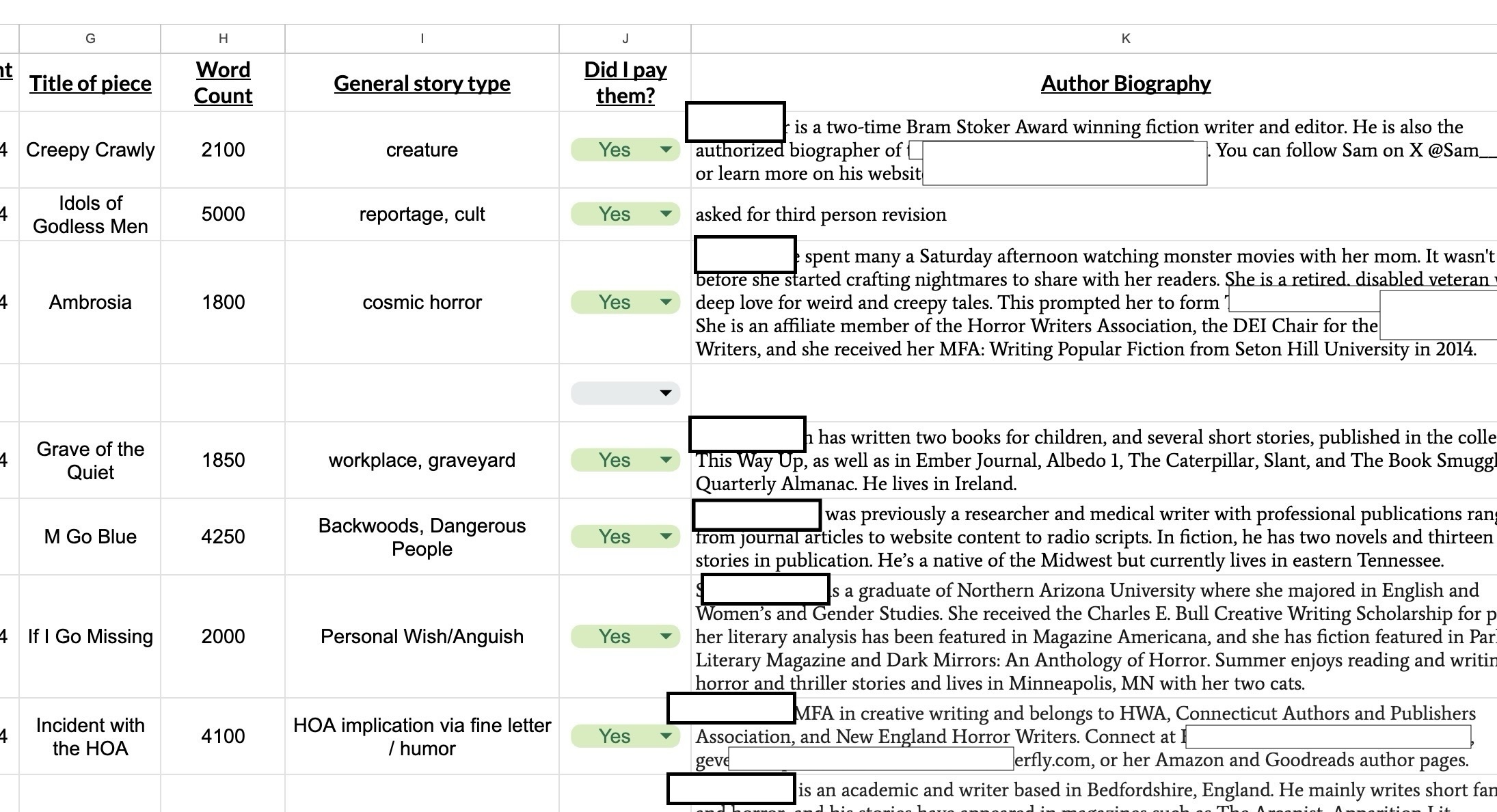 In the case of our inaugural anthology, the editor (that’s me) is gathering the third-person bios in the tracking spreadsheet that’ll be crucial to designing the book block (the compilation of all the book’s contents).