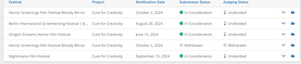 I’ve created a filmfreeway account for myself (check it out!) and have submitted a short screenplay to four festivals that encourage horror short screenplay submissions… I’m crossing my fingers as I dip my toes into waters I’ve been staring at for years.