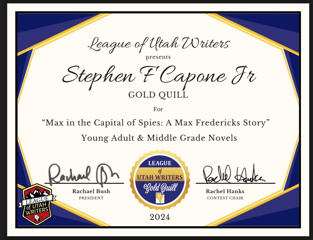 Last Saturday at the League of Utah Writers awards banquet, my book Max in the Capital of Spies was awarded the Gold Quill in the category of “Young Adult and Middle Grade Novels.” There was a Diamond Quill award winner, and there were Silver, Bronze, and Recommended Read awards given in the category as well (congratulations to Alex Hugie, Kat Farrow, Amanda Empey, and Robyn Dabney, respectively).