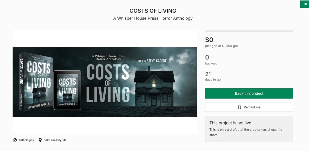 First and foremost, I hope to spread the word (and get y’all to spread the word, if you’re willing) that the Kickstarter project page for Costs of Living (due out 9/1/25) is live and absorbing—er, embracing all readers who would follow for updates and for the project’s official launch in late January 2025. Please click on “remind me” on the project’s HQ.