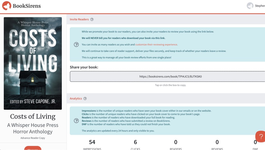 - I’ve posted the book in BookSirens and have approved the first three requests for an ARC. The listing fee is $10, and each review copy sent to a reader costs me $2. I’ve got a maximum number of 25 spots available to cap my potential costs. There was an easy process to get it posted there.