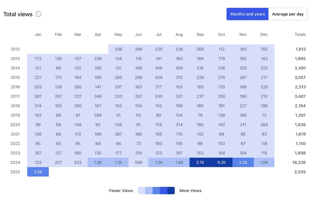 Compare that “biggest year before Whisper House Press” to this first year of Whisper House Press (not even a full year, since we began operations in April 2024) and you’ll find a 33ish percent increase in word output and a doubling of total posts. Interesting, but ascribing meaning is tricky: 2024 featured the shortest average word count, near lowest average likes per post, near lowest average comments per post… and that makes me wonder: is my goal increased likes and comments? Probably not. But it’s interesting to me, anyhow.