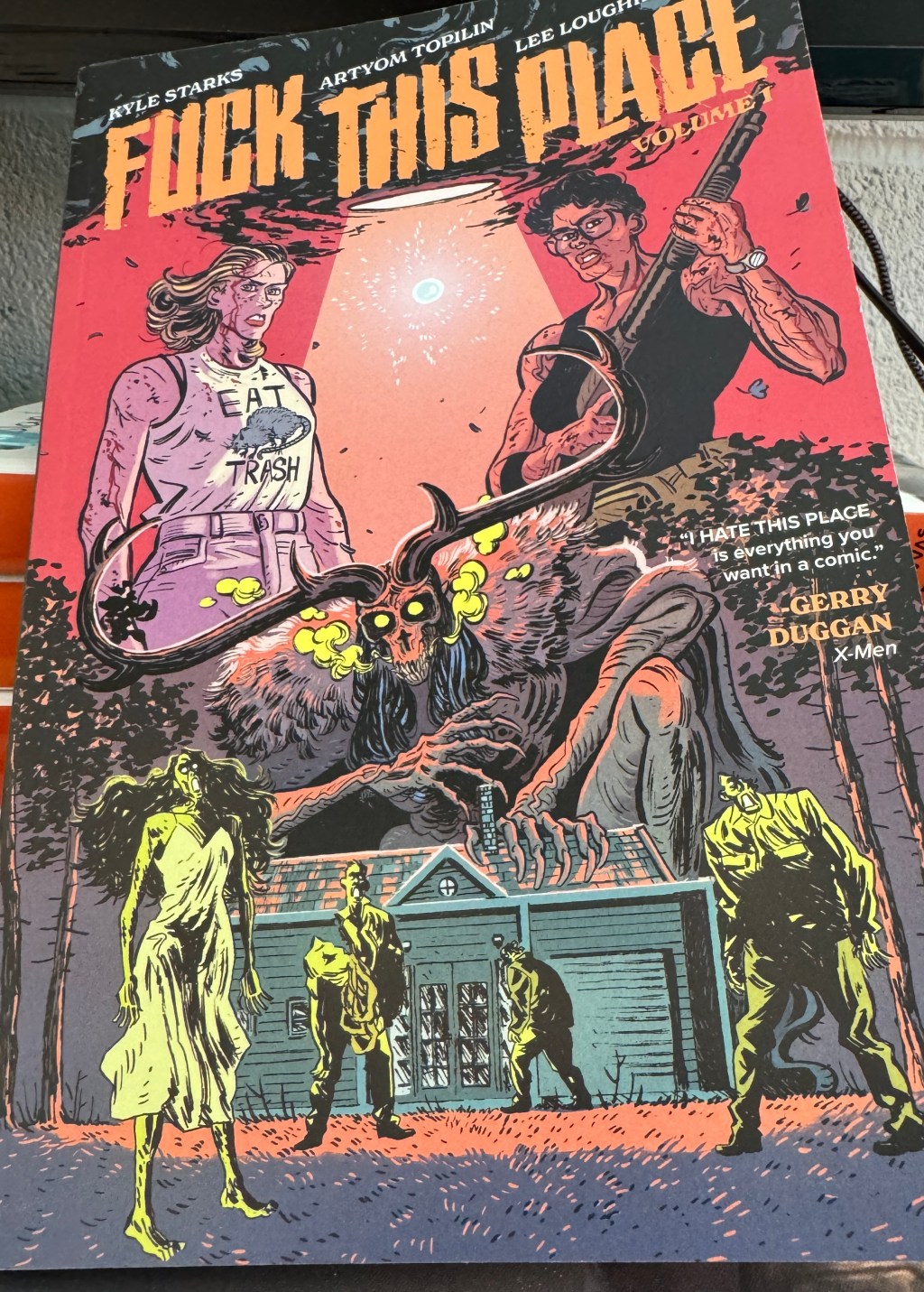 A few weeks ago, I treated myself to an afternoon in the two big comic book shops (that I know of) in Salt Lake City, Utah: Black Cat Comics in Sugarhouse and Dr. Volt’s Comic Connection at the Gateway. It’s tough for me to get into a new medium because I feel overwhelmed by the sheer quantity of material available, but I’ve been reading a volume of Epitaphs From the Abyss that’s due out later this year and wanted to sink my teeth into some other horror comics. Somehow, I got really lucky and found my way to Fuck This Place Vol. 1.