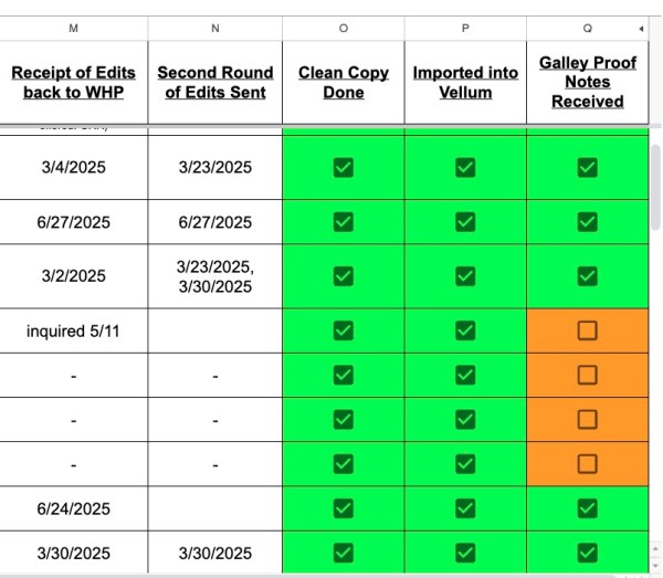 I’ve received notes back from many authors and am awaiting responses from as many as 21 of those remaining. I am sending out one reminder email with an attached revised galley proof document. Anyone who hasn’t responded within the allotted time frame will miss their chance to respond before I create a review copy for Kirkus, Apex, Locus, etc.