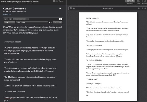 I’ve also been working on the trigger warnings. I sent out a google survey some time ago (a “form”) and asked for author assistance on this point, and I’m inputting their stuff in the voice of the editor with consistency in the end matter. This section is still in development but isn’t long.